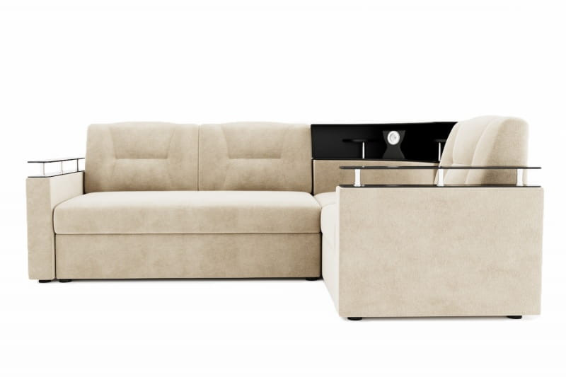 Особенности дивана: Изысканный и стильный трансформер для оригинальных дизайнерских решений! Практичный и вместительный. Барная полка, встроенная в диван. Поможет выгодно зонировать пространство за счёт угловой модели. Имеет встроенную подсветку. Ширина подлокотника - 12 см, длина - 83 см. Высота полки, где находится подсветка: 40 см. Провода для подсветки приобретаются отдельно. Угол дивана универсальный.
